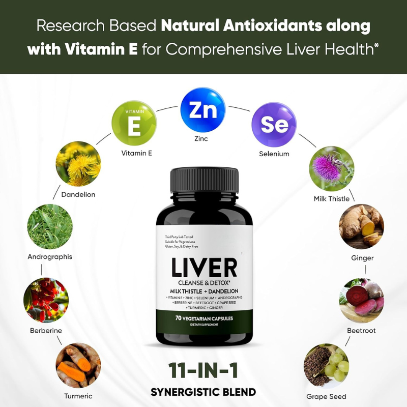 Our Liver Support formula combines 11 clinically studied ingredients including Milk Thistle (Silymarin), Dandelion Root, and Turmeric that work together to: